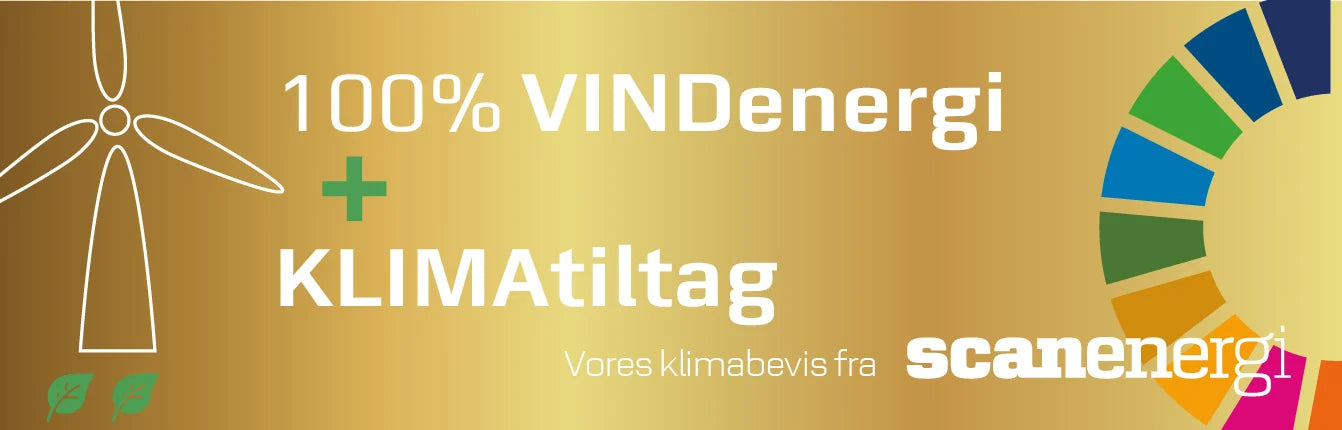 Omlagt vores samlede energiforbrug til CO2-neutral energi fremstillet ved dansk vindenergi. Den strøm vi anvender, matches 100% med et oprindelsescertifikat på vindenergi fra danske vindmøller. På den måde får vi strøm uden CO2-udledning og investerer samtidig i udviklingen af og omlægningen til vedvarende vindenergi.