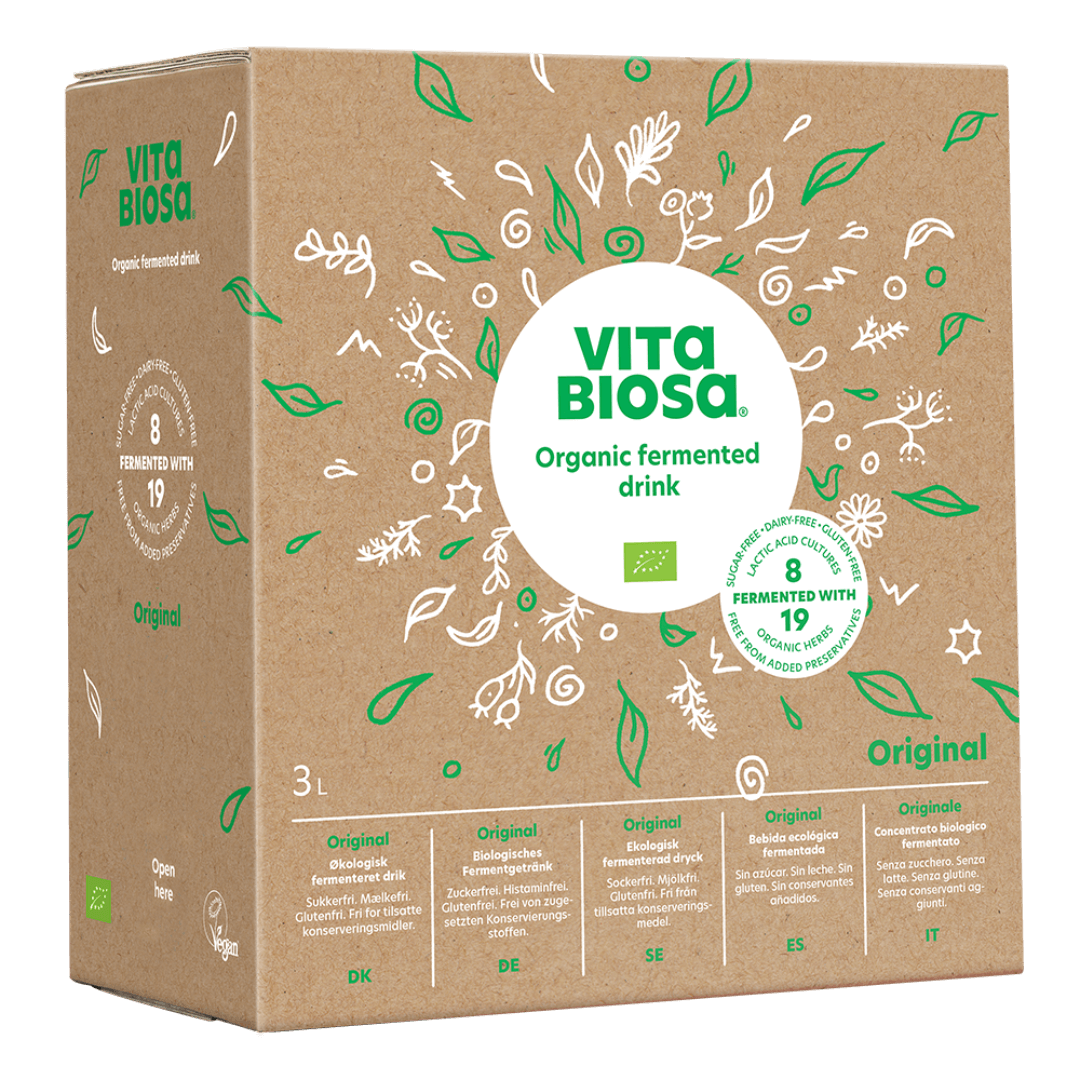 Vita Biosa er fermenteret med 19 forskellige økologiske urter, som både giver en god smag og virker som næring for bakterierne i fermenteringsprocessen.